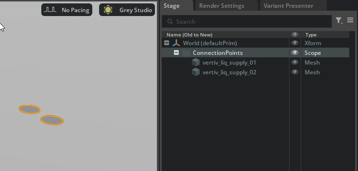 To enable simulation runtimes to accurately generate data using AI Factory Digital Twin SimReady assets, you must add USD prims to the composed stage to indicate various connection points to other parts of the facility. This includes connections for electrical power, thermal cooling piping, and air vents.